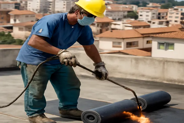 Como funciona: A manta é desenrolada sobre a laje (que precisa estar limpa, seca e regularizada), aquecida com maçarico até o asfalto da face inferior derreter, e então pressionada contra a superfície. As emendas entre as faixas são feitas com sobreposição mínima de 10 cm.